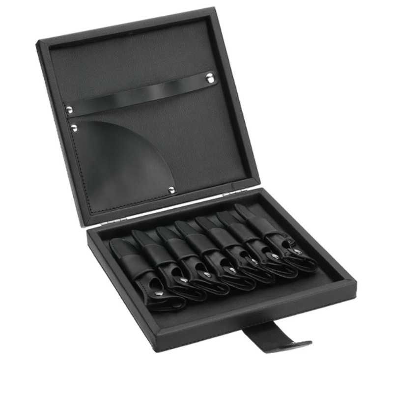 Κομψό και στιβαρό κουτί ψαλιδιού μαλλιών σε μαύρη δερμάτινη εμφάνιση.